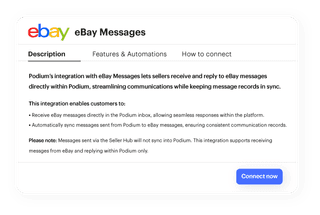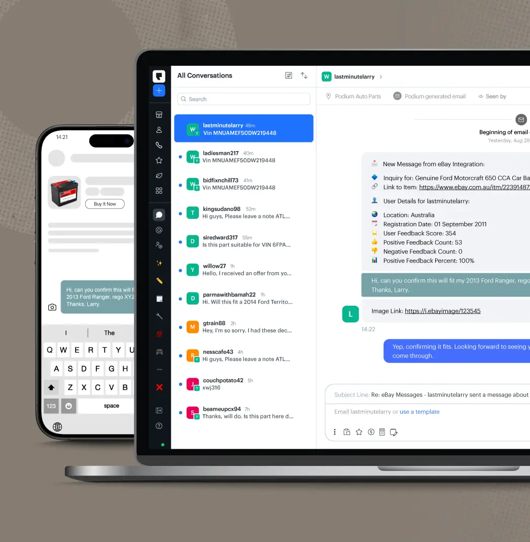 Seamlessly integrated with eBay Messages, Podium centralises buyer conversations in one inbox, enabling instant responses and automatic syncing. This streamlined workflow keeps communication consistent, empowers your team to manage offers effortlessly, and drives stronger engagement and sales with every interaction.